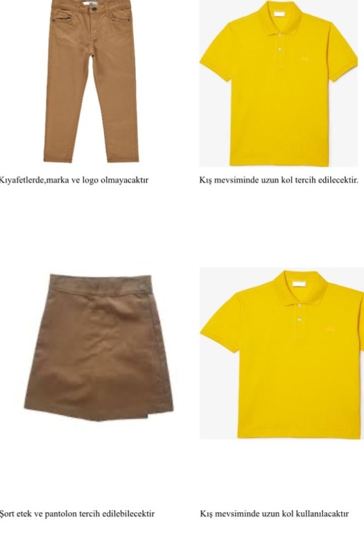 32744 sayılı Resmi Gazete yayınlanan yönetmeliğe göre Milli Eğitim Bakanlığı'na bağlı Okul Öğrencilerinin Kılık ve Kıyafet Yönetmeliğinde değişiklik yapılmıştır. Değişikliğe göre; * İlkokul, ortaokul ve lise kademelerinde tek tip kıyafet uygulamasına geçilecektir. * Belirlenecek kıyafet 4 eğitim-öğretim yılı geçmeden değiştirilmeyecektir. * Okul kıyafeti değiştiğinde ara sınıflardaki öğrenciler bir üst öğrenim kademesine geçinceye kadar mevcut okul kıyafetini giymeye devam edebilecektir. 6 Aralık 2024 tarihli öğrenci kılık ve kıyafetlerine dair yönetmelikte yapılan değişiklik gereği, 2025-2026 Eğitim öğretim yılından itibaren okulumuz öğrencilerinin kullanması gereken öğrenci kıyafetleri Üst; sarı (257 kodlu) renk baskısız ve resimsiz tişört, lagos tişört, uzun kollu lagos tişört, kışlık uzun kollu kapişonlu swet, Alt; Camel renk pantolon, etek, şort, şort etek olması uygun görülmüştür.Belirlenen Okul Forma Renkleri aşağıdaki gibidir ; (NOT: Formalar ve renkleri temsilidir.) |